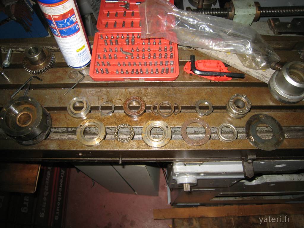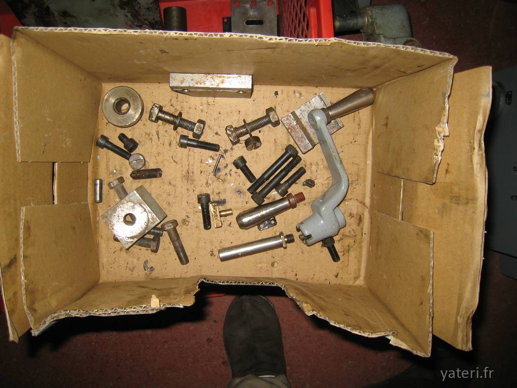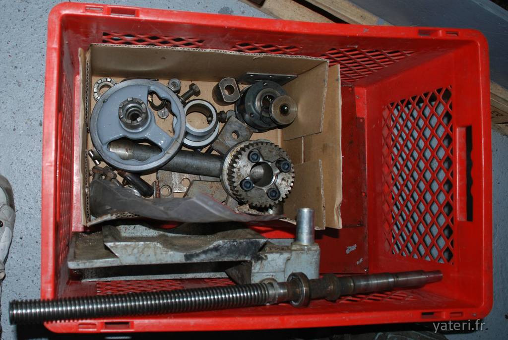 Elle était très fortement démontée. Les pièces nécessaires au remontage (visseries, lardons, vis d'entrainement, moteurs, goupilles...) étaient stockées en vrac dans un panier. Lors d'un premier voyage et après un examen rapide, j'ai décidé de me lancer, un peu l'aveugle il est vrai.