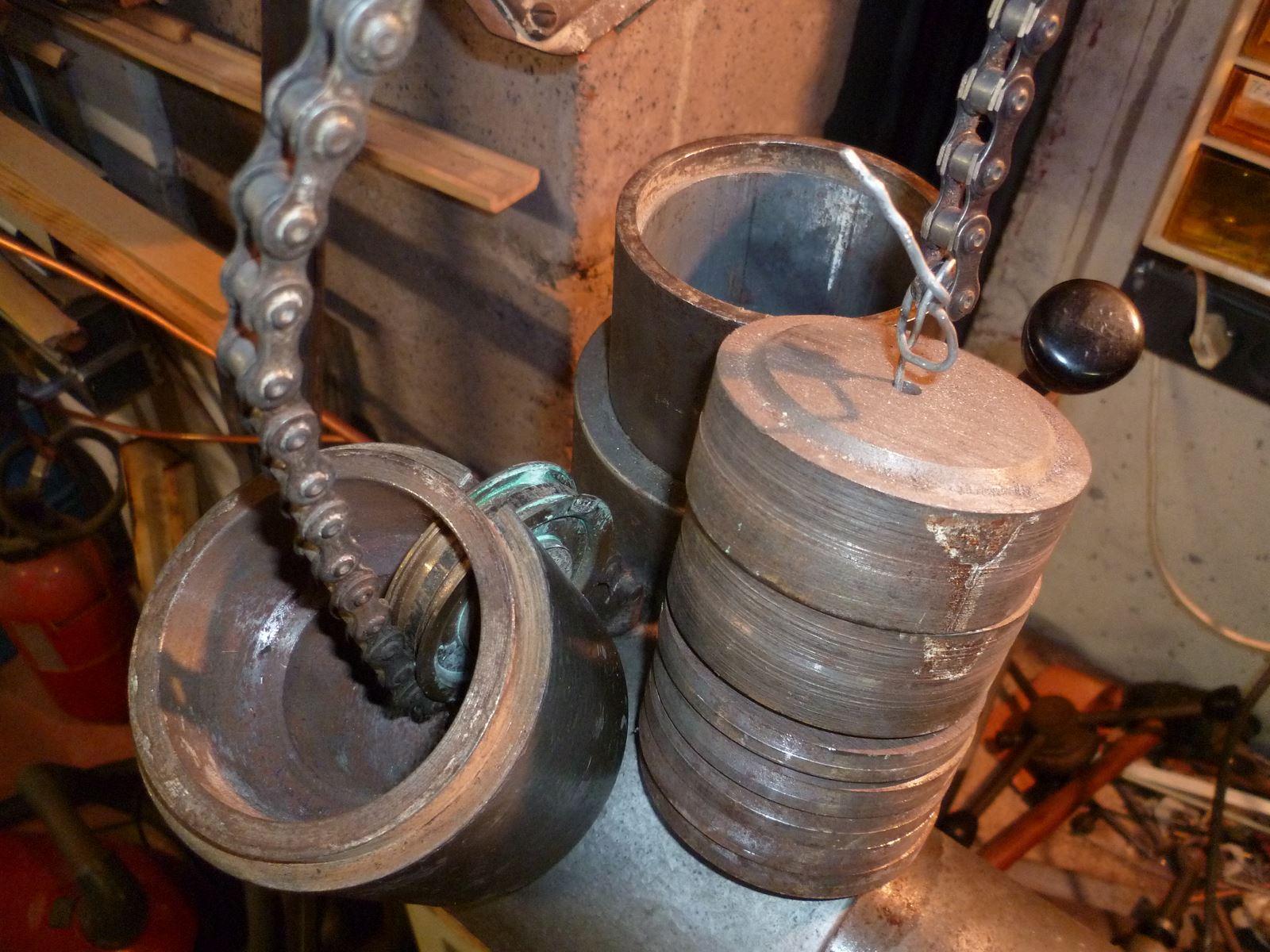 Elle est équipée d'un contre-poids logé dans la colonne, qui est une grosse blague puisque totalement insuffisant (environ 4kg vs 25kg) et ne fait en réalité qu'ajouter du poids supplémentaire à la perceuse, que j'estime d'ailleurs à environ 80Kg.