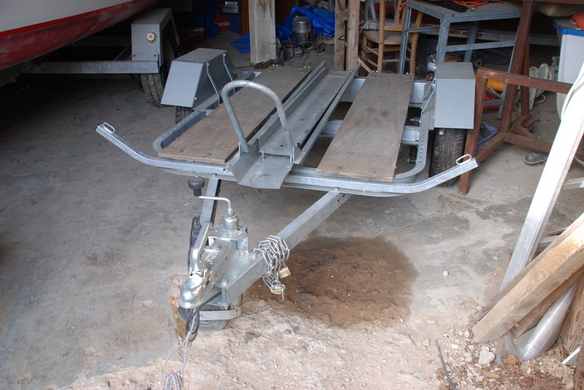 La remorque porte moto est dépouillée de ses rails pour ne laisser plus que la structure de base.